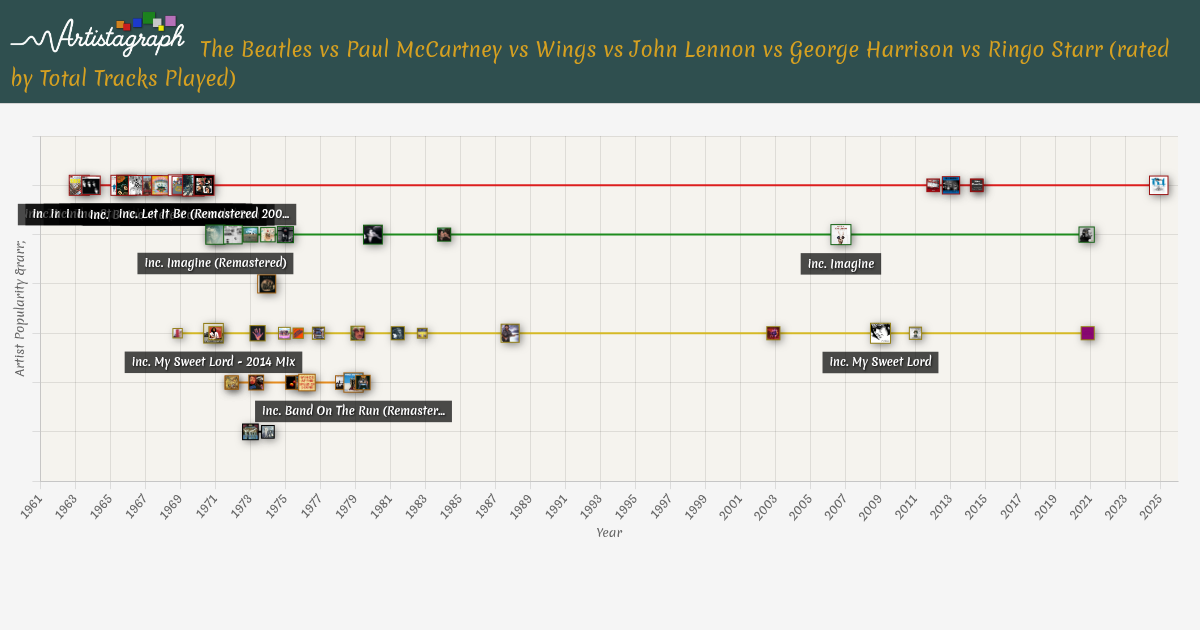 The Beatles vs Paul McCartney vs Wings vs John Lennon vs George Harrison vs Ringo Starr (rated by Total Tracks Played)