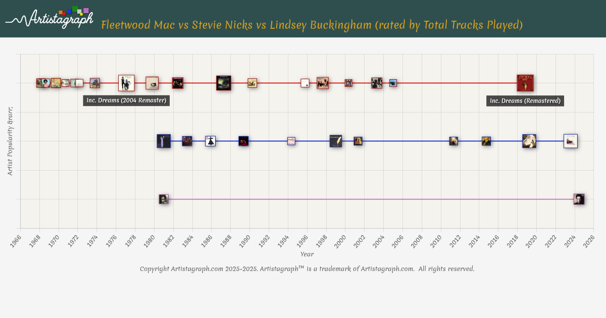 Fleetwood Mac vs Stevie Nicks vs Lindsey Buckingham (rated by Total Tracks Played)