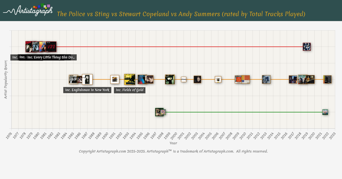 The Police vs Sting vs Stewart Copeland vs Andy Summers (rated by Total Tracks Played)