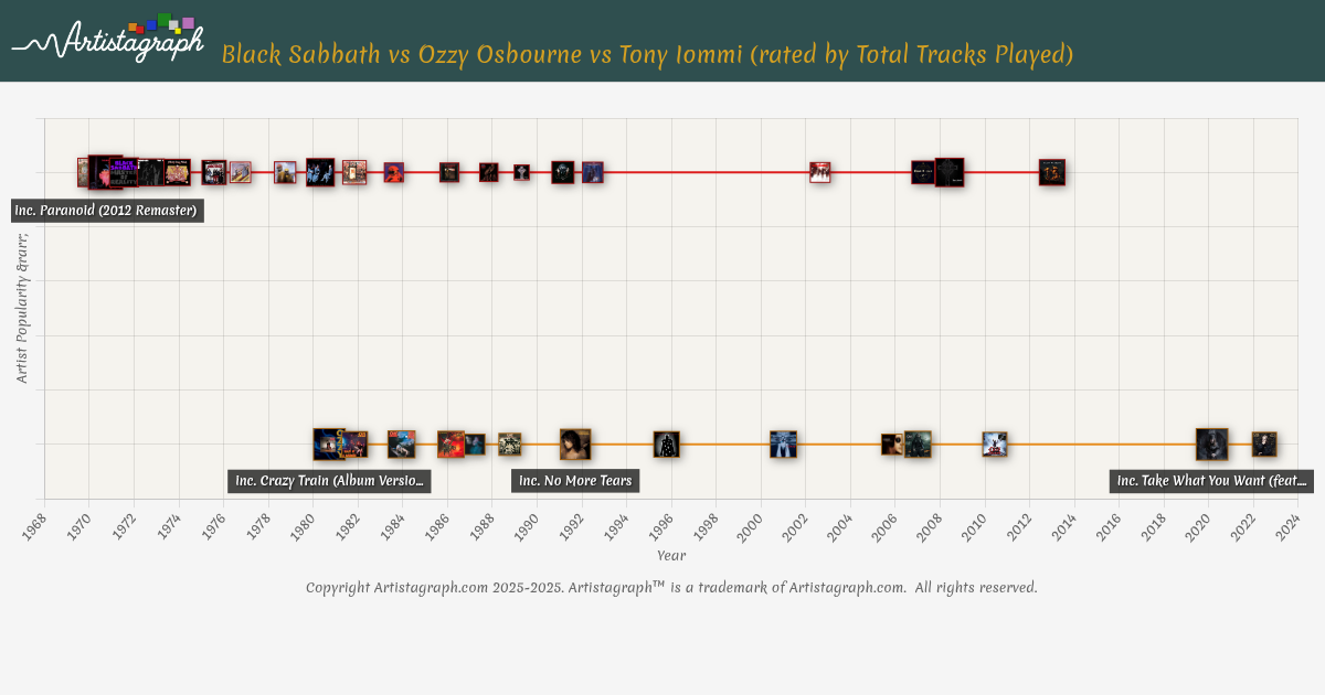 Black Sabbath vs Ozzy Osbourne vs Tony Iommi (rated by Total Tracks Played)