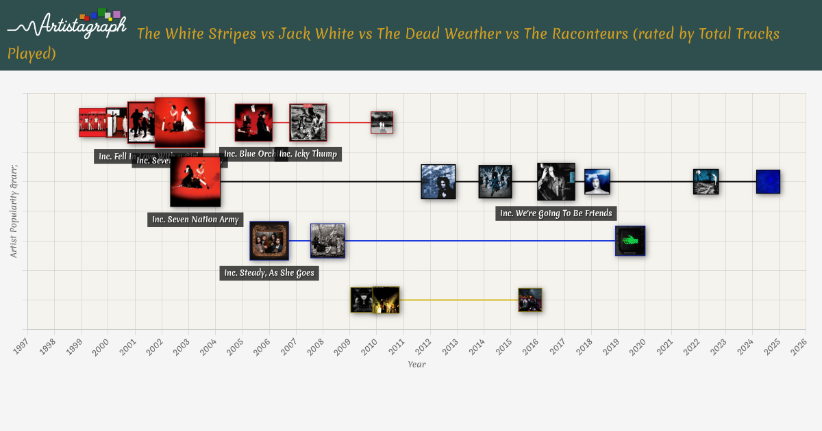 The White Stripes vs Jack White vs The Dead Weather vs The Raconteurs (rated by Total Tracks Played)