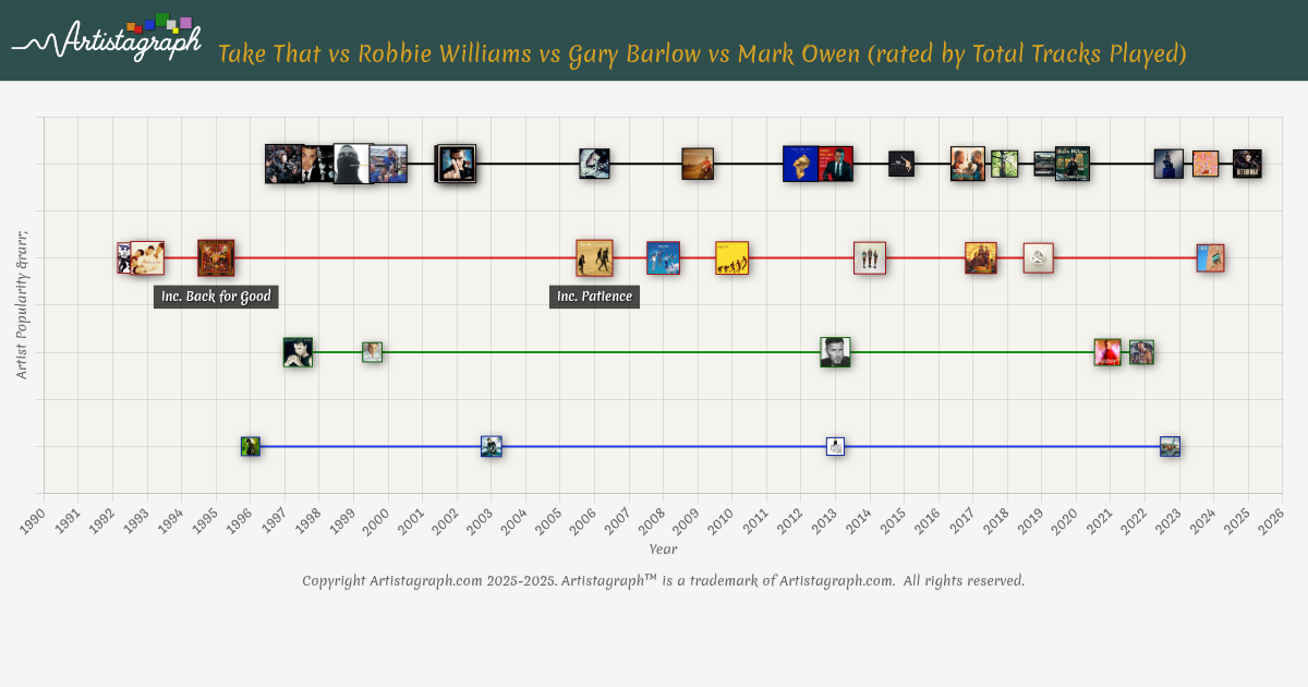 Take That vs Robbie Williams vs Gary Barlow vs Mark Owen (rated by Total Tracks Played)